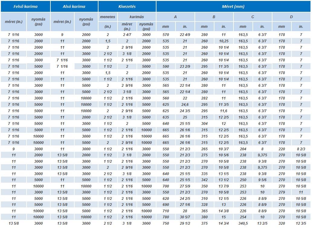 The two side connectors of the production head have API 1 1/2” LP, API 2” LP, or API 2 1/2” LP threads; the connectors are with threaded studs and with sealing rings, depending on the size and pressure rating of the gate valve or of the threaded flange (2 1/16”, 2 9/16” or 3 1/8”).